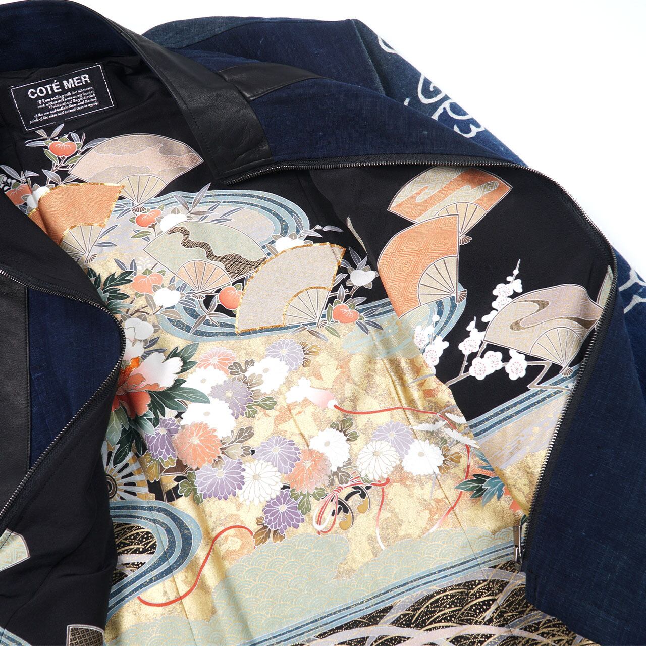 Reconstructed using multiple patchworks of traditional Japanese indigo-dyed fabrics. The jacket also incorporates the texture of sashiko stitching, giving it a distinctively Japanese feel. The lining is made from vintage kimono fabric, showcasing a meticulous attention to detail.