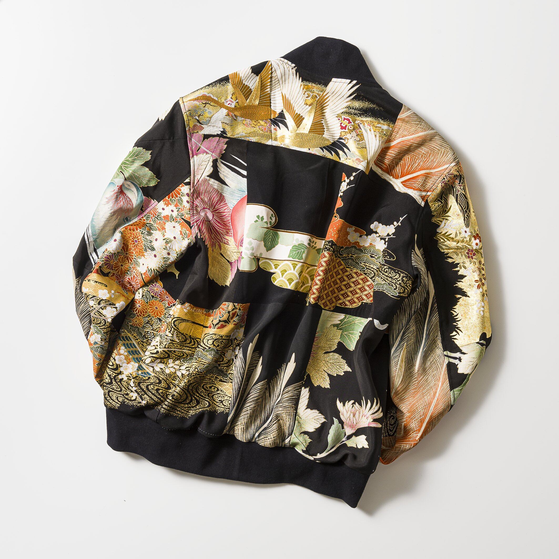 All item are handmade and one of a kind. This is one of the best-looking clothes use kimono that imported from Kyoto on the all material of a bomber jacket. You can dress in both street and mode. It's perfect for you who don't want to wear the same clothe as others and want to show their individuality! 着物の留袖生地を使用し製作したボンバージャケット。着物は京都の錦織を使用。ストリートにもモードにも着こなすことができる万能な1着です。 一点一点自社工場にてハンドメイドで製作しているため、完全に世界で1着のボンバージャケットです。人と被りたくない・個性を発揮したいという方にはぴったりな1着。 --Size (cm)-- Medium Size ・Body length(着丈) :62cm ・Shoulder width(肩幅) :54cm ・Body width(身幅) :55cm ・Sleeve length(袖丈) :60cm --Material-- Medium Size ・Silk(絹) :100%