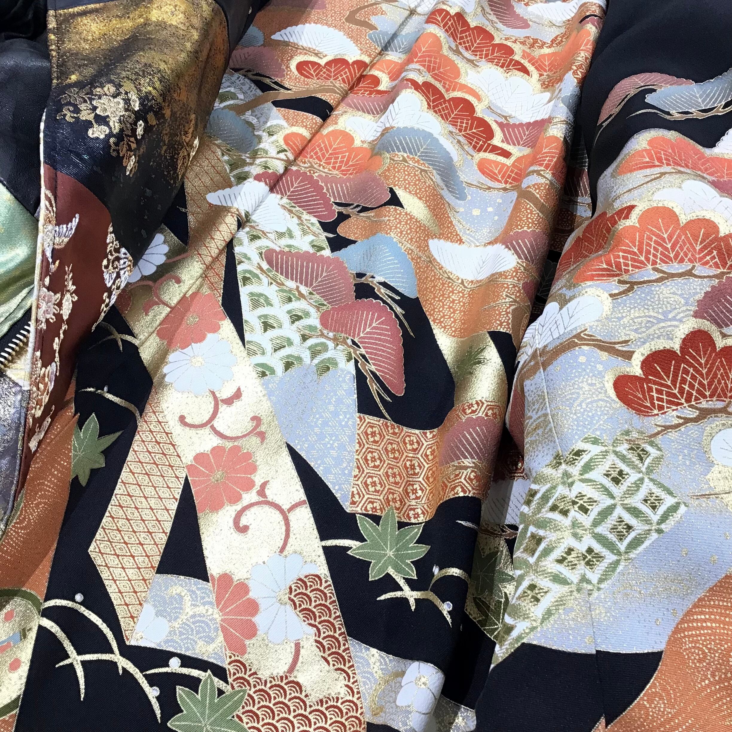 ヴィンテージの着物と、ヴィンテージレザーを再構築したライダース。