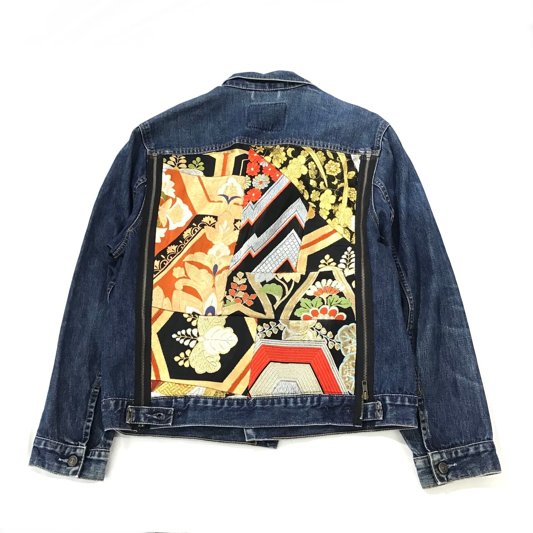 All item are handmade and one of a kind. This is one of the best-looking clothes use kimono that imported from Kyoto on the back and sleeve of a denim jacket that bleached by hand. You can dress in both street and mode. It's perfect for you who don't want to wear the same clothe as others and want to show their individuality!