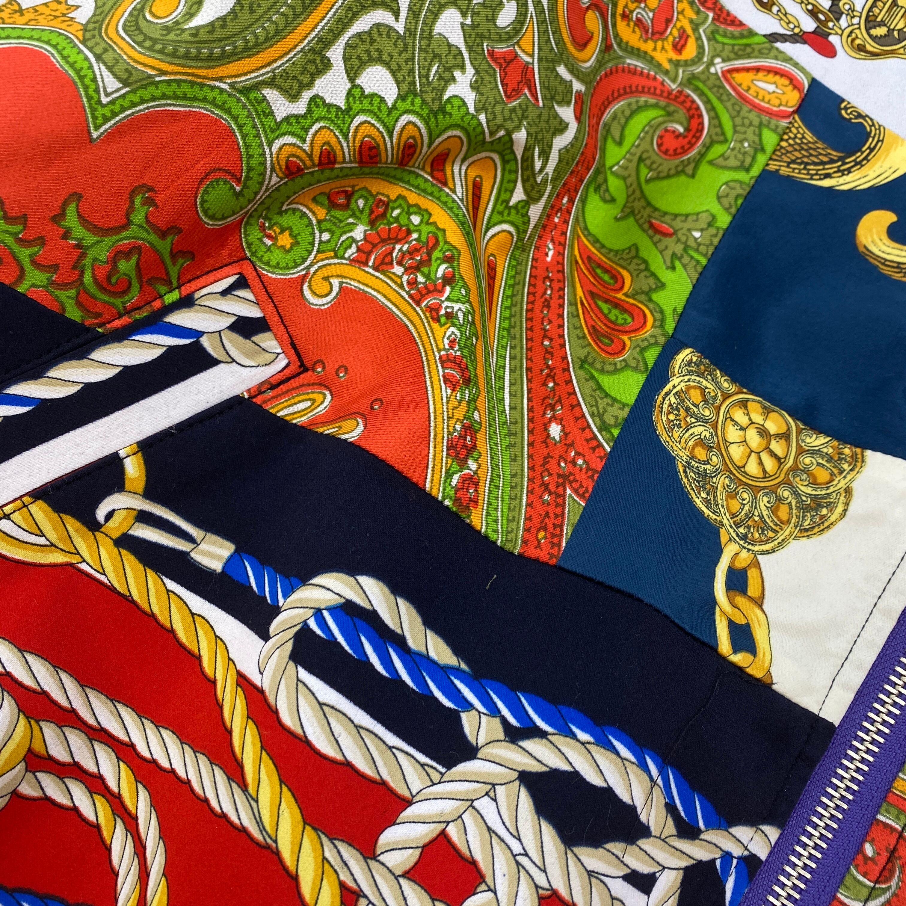 オモテはヴィンテージスカーフを複数使用し、再構築。ウラはヴィンテージの着物を使用しています。
