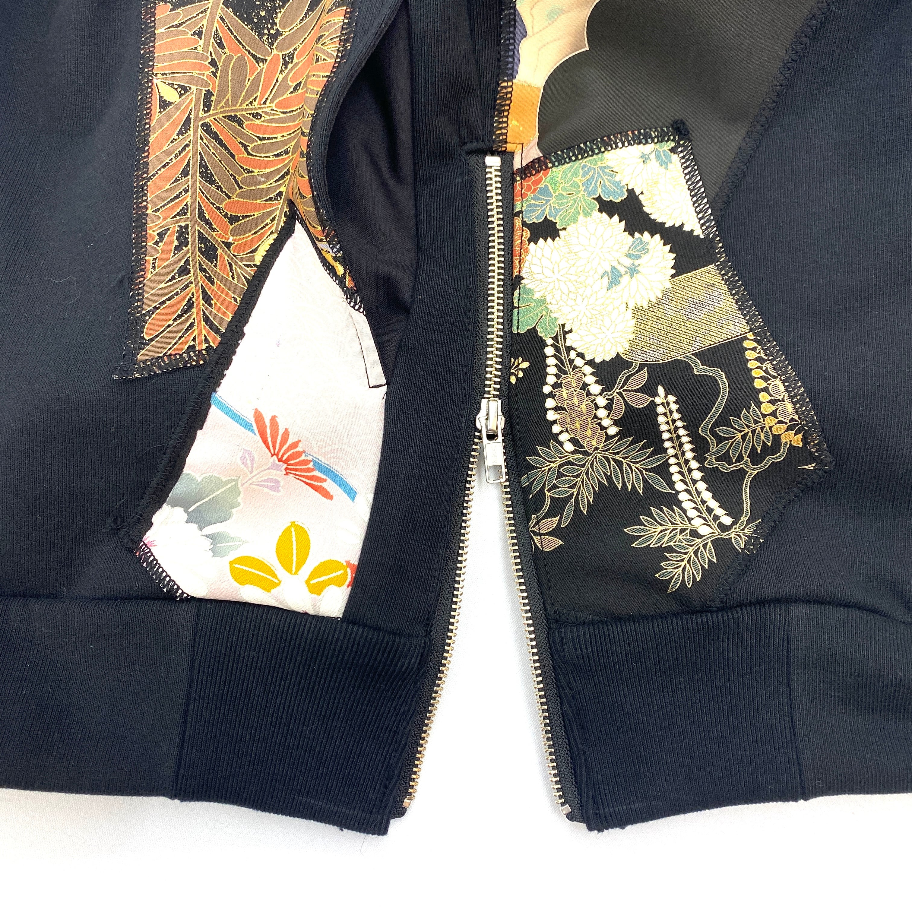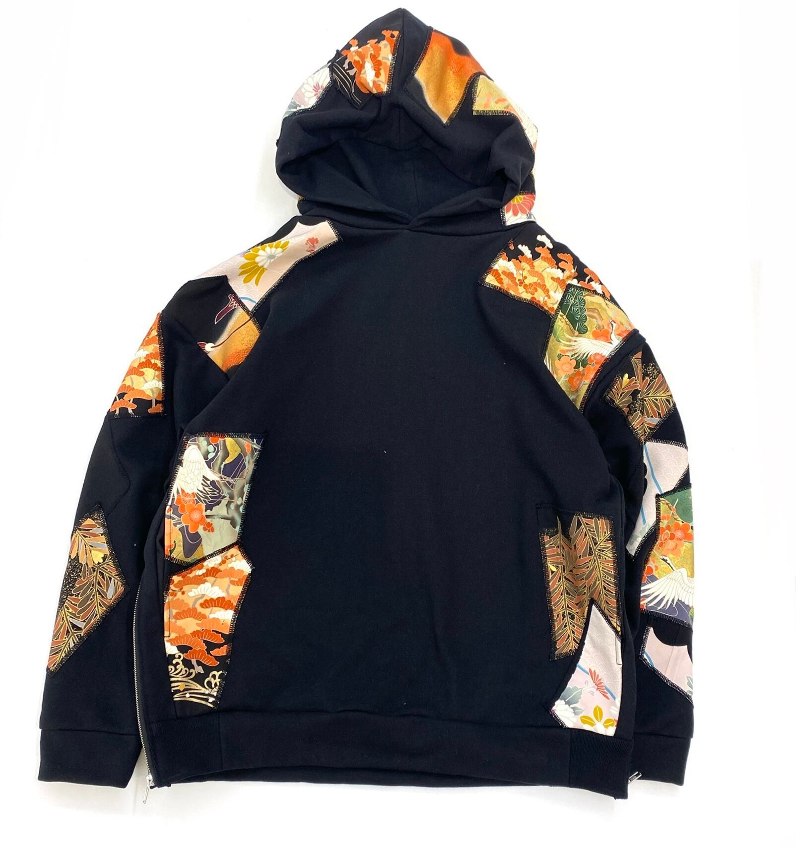 ランダムカットの黒留袖パッチを付けた裏毛フードパーカー。