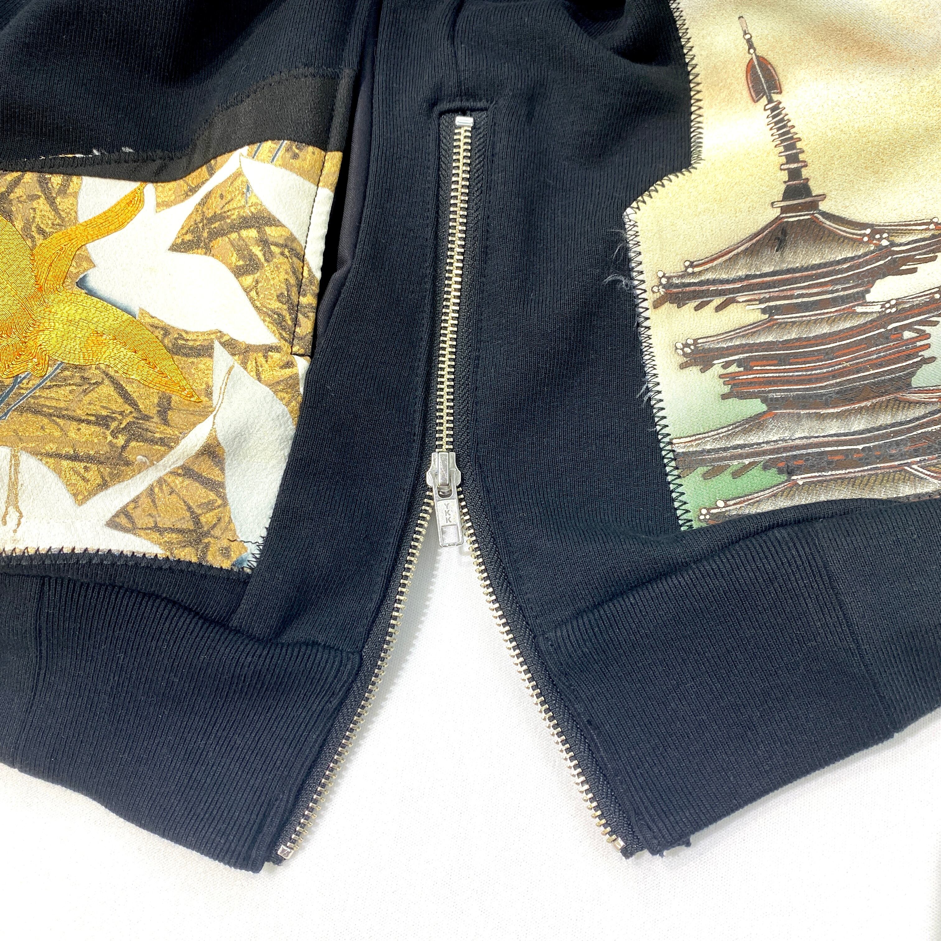 ランダムカットの黒留袖パッチを付けた裏毛フードパーカー。
