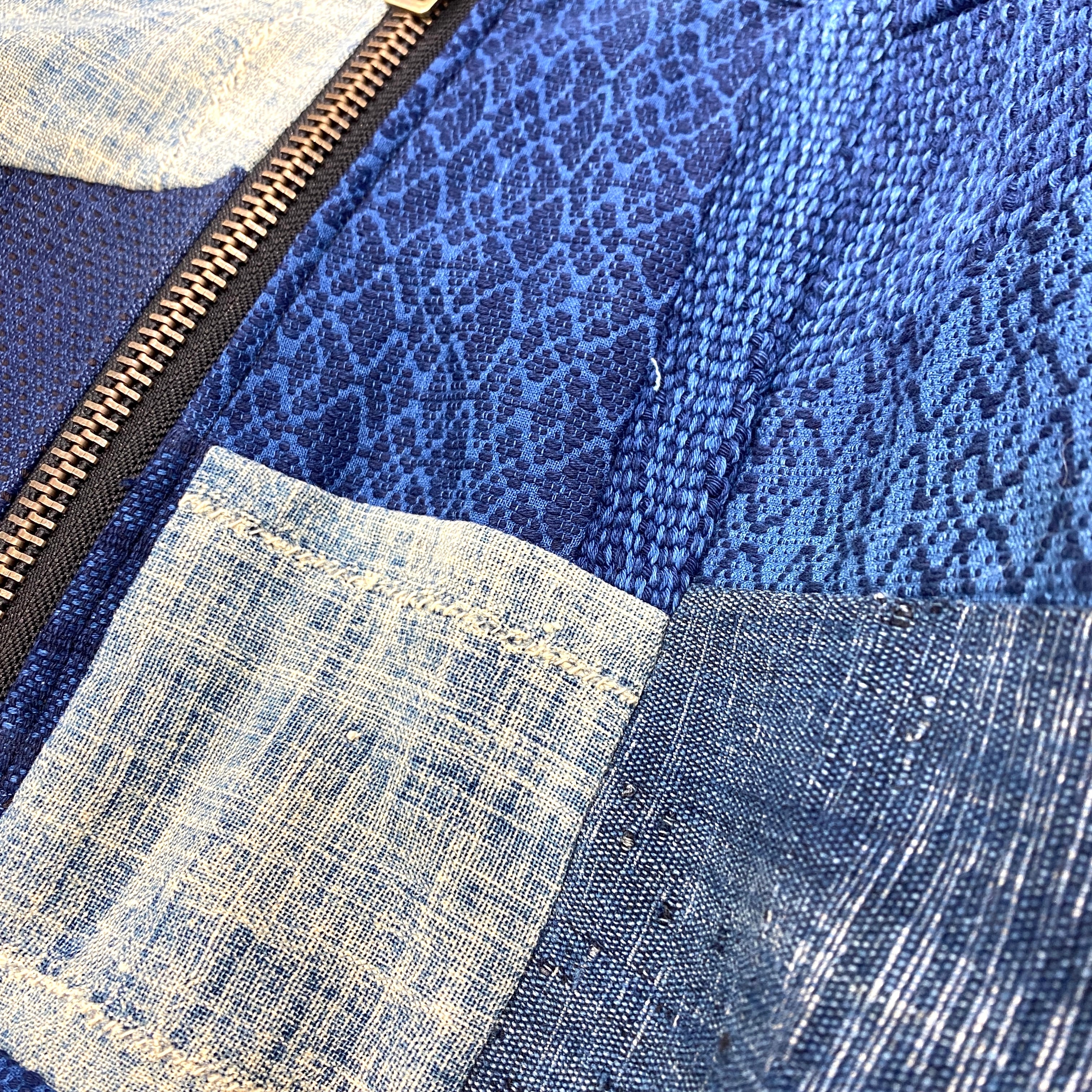 オモテは日本の伝統的な素材の、藍染め生地を複数使用し、再構築。ウラはヴィンテージの着物を使用しています。