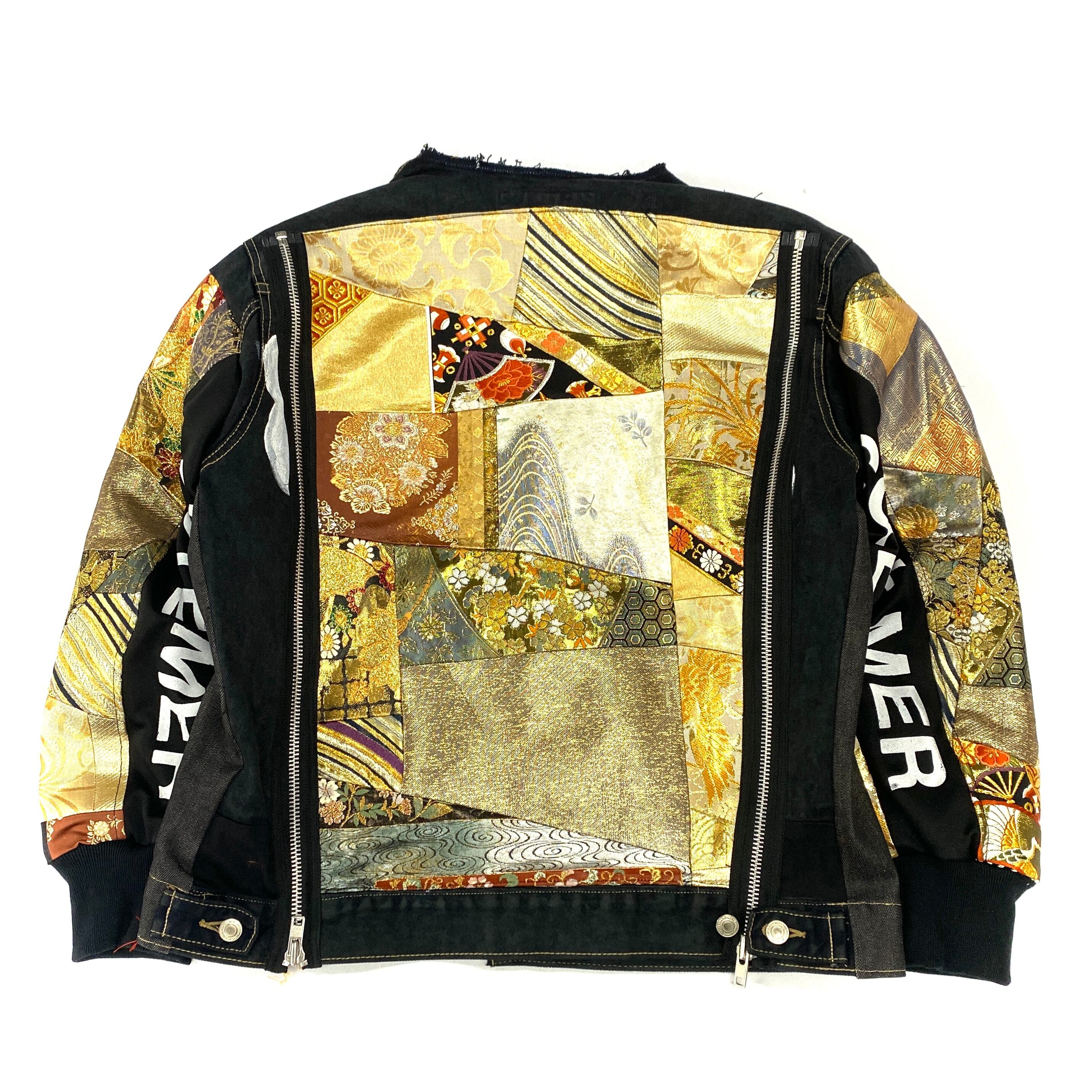 デッドストックのデニムジャケットを脱色し、独特の風合いを出した上で、背面に日本を象徴する着物生地を施した1着。