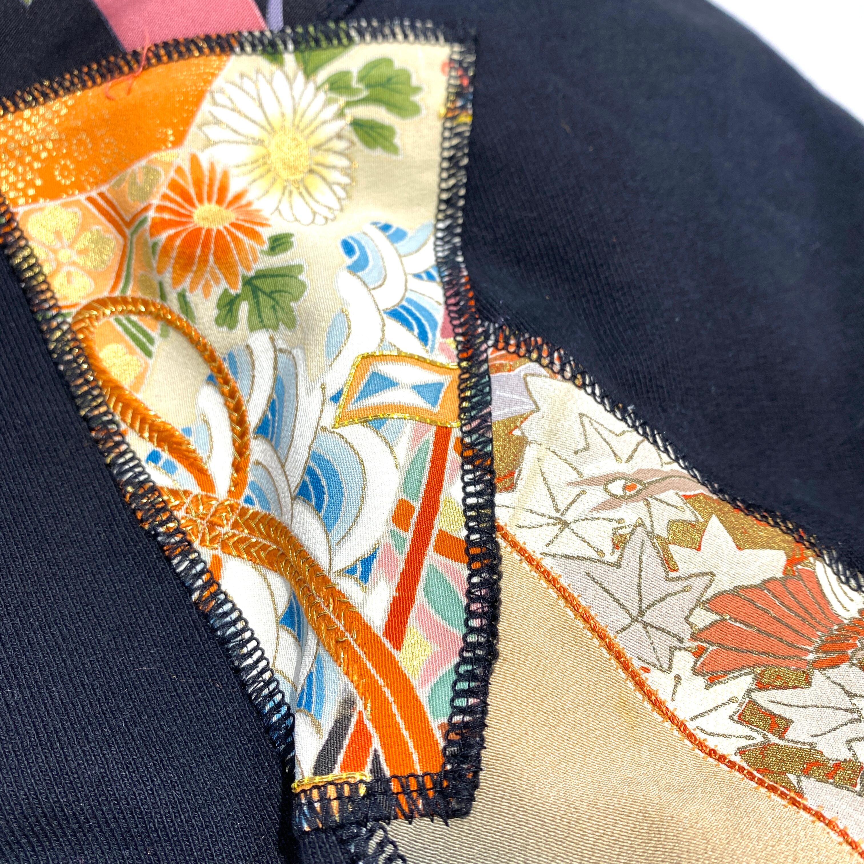 A brushed fleece hoodie with a random-cut kimono worn over it. The item features multiple traditional Japanese kimono fabrics, showcasing the material's charm to the fullest. By reimagining items imbued with the history of old Japan into modern pieces that can be worn both on the streets and in high fashion, it has become a versatile piece that can be worn by anyone.