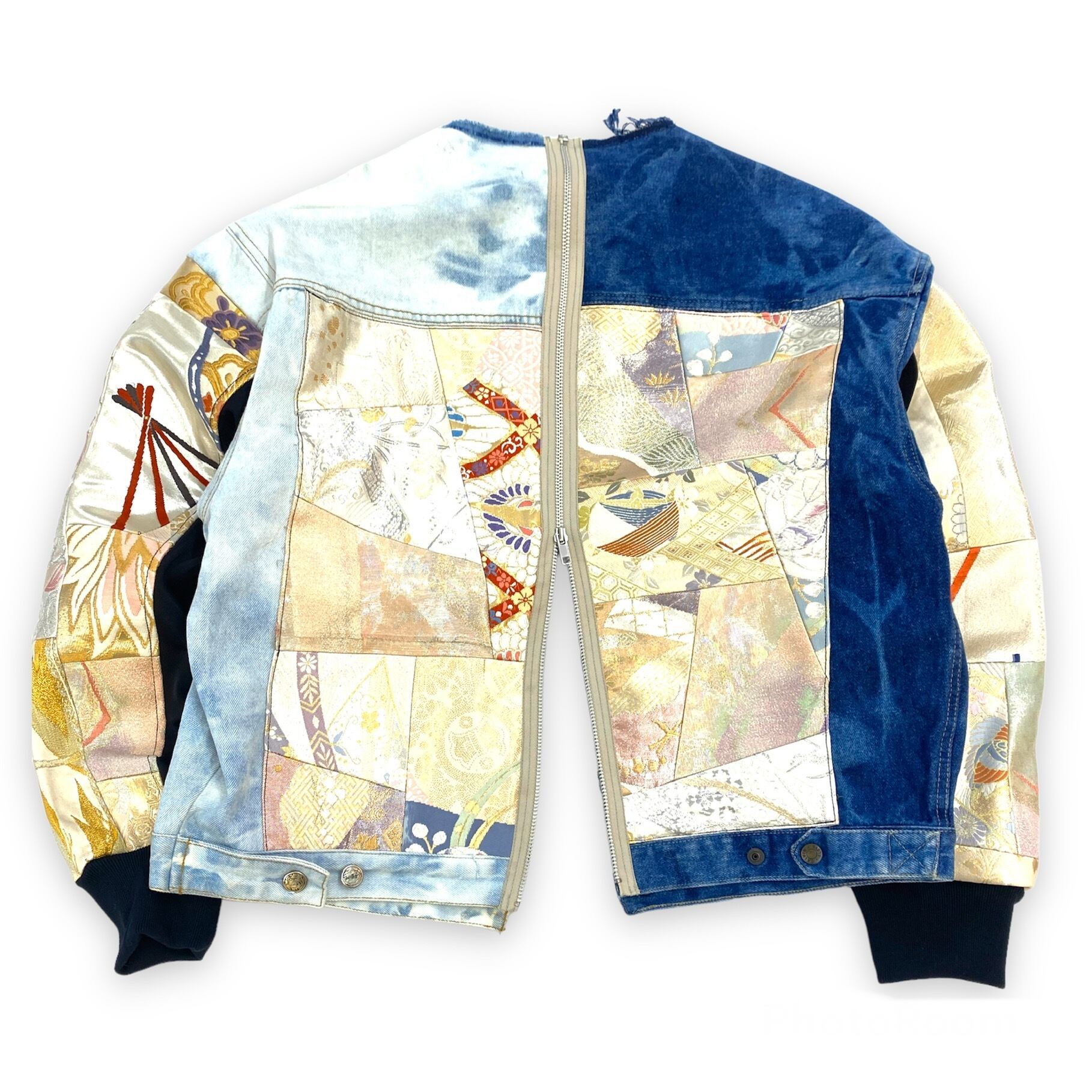 デッドストックのデニムジャケットを脱色し、独特の風合いを出した上で、背面に日本を象徴する着物生地を施した1着。