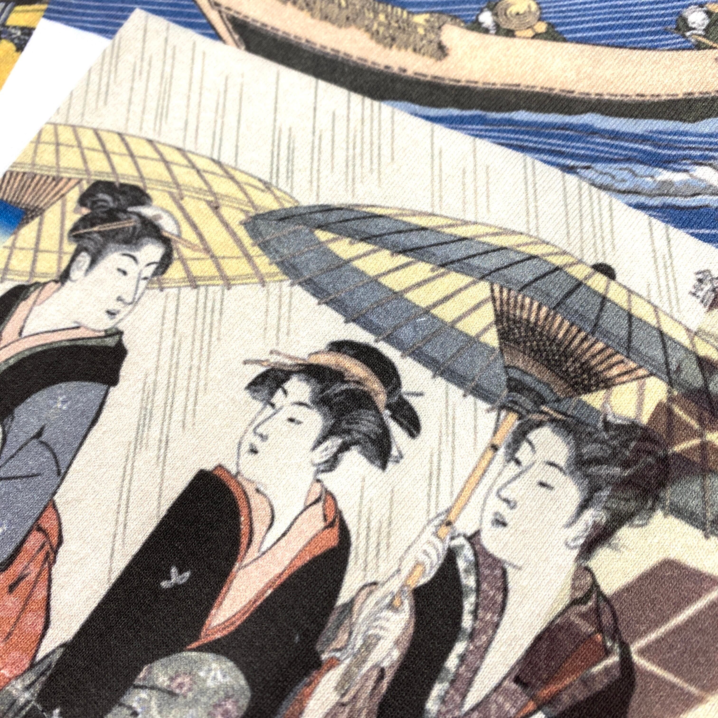 We maximize the appeal of materials that evoke the charm of Japan's old-fashioned history and traditions and transform them into contemporary items. This special piece features a large print of traditional Japanese kimono patterns and representative ukiyo-e prints. The arrangement of the patterns is unique for each item.