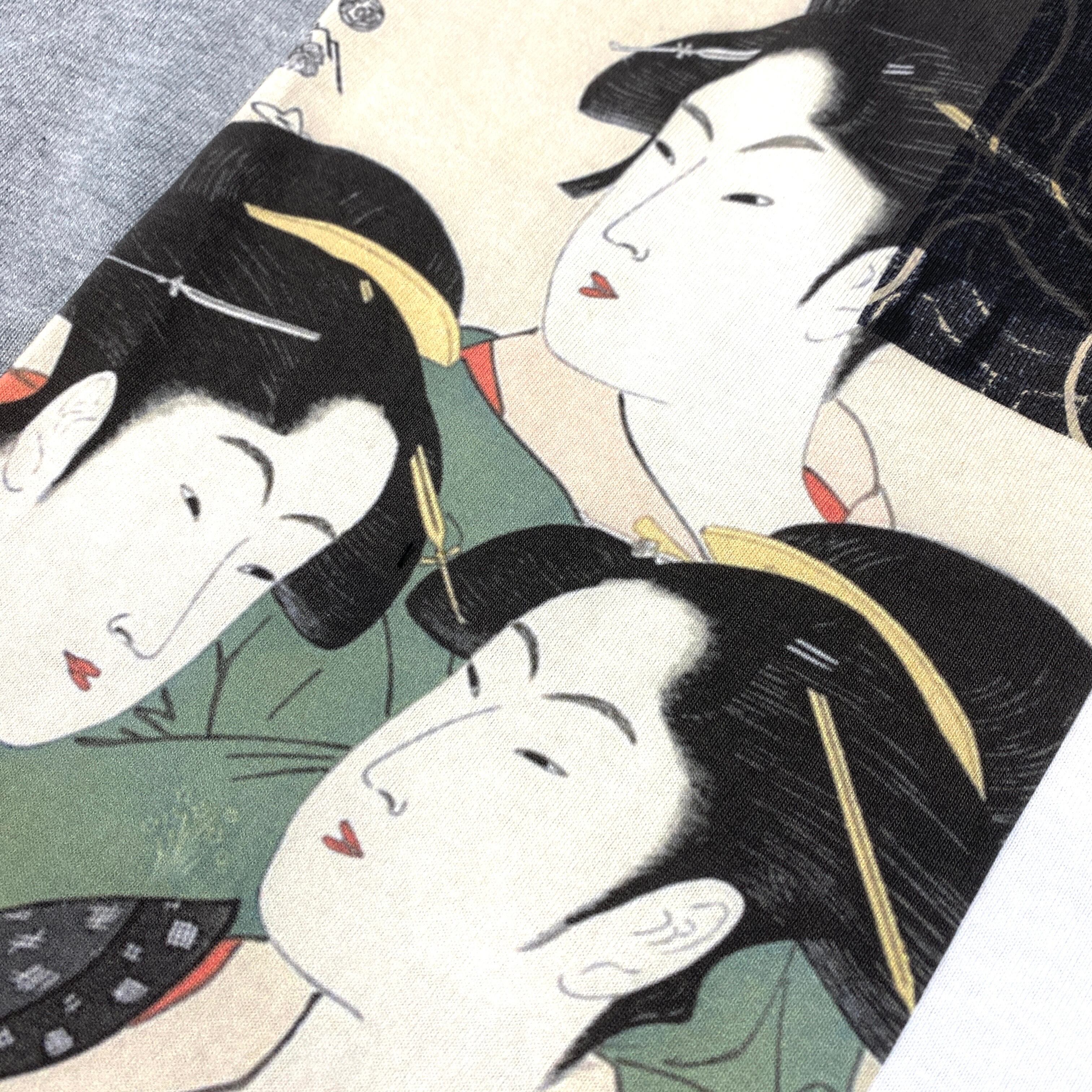 We maximize the appeal of materials that evoke the charm of Japan's old-fashioned history and traditions and transform them into contemporary items. This special piece features a large print of traditional Japanese kimono patterns and representative ukiyo-e prints. The arrangement of the patterns is unique for each item.