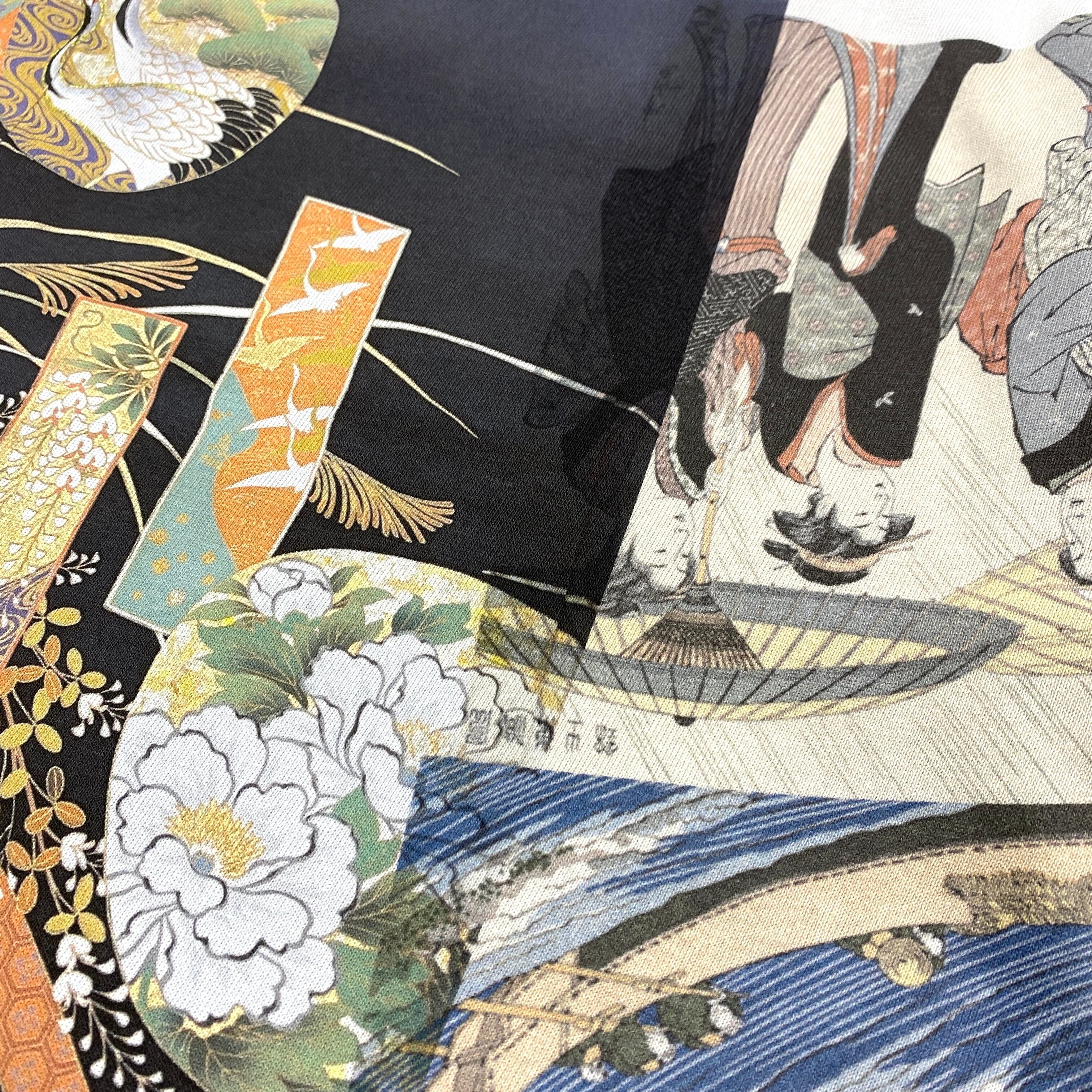 We maximize the appeal of materials that evoke the charm of Japan's old-fashioned history and traditions and transform them into contemporary items. This special piece features a large print of traditional Japanese kimono patterns and representative ukiyo-e prints. The arrangement of the patterns is unique for each item.