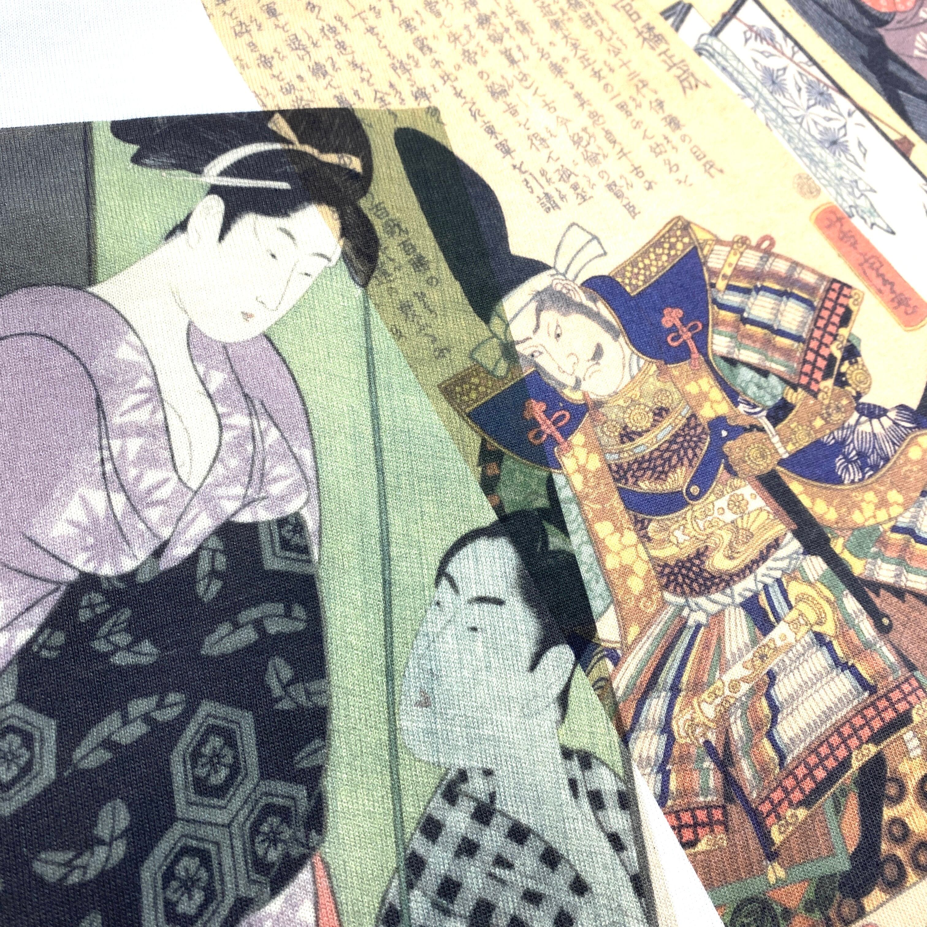 We maximize the appeal of materials that evoke the charm of Japan's old-fashioned history and traditions and transform them into contemporary items. This special piece features a large print of traditional Japanese kimono patterns and representative ukiyo-e prints. The arrangement of the patterns is unique for each item.