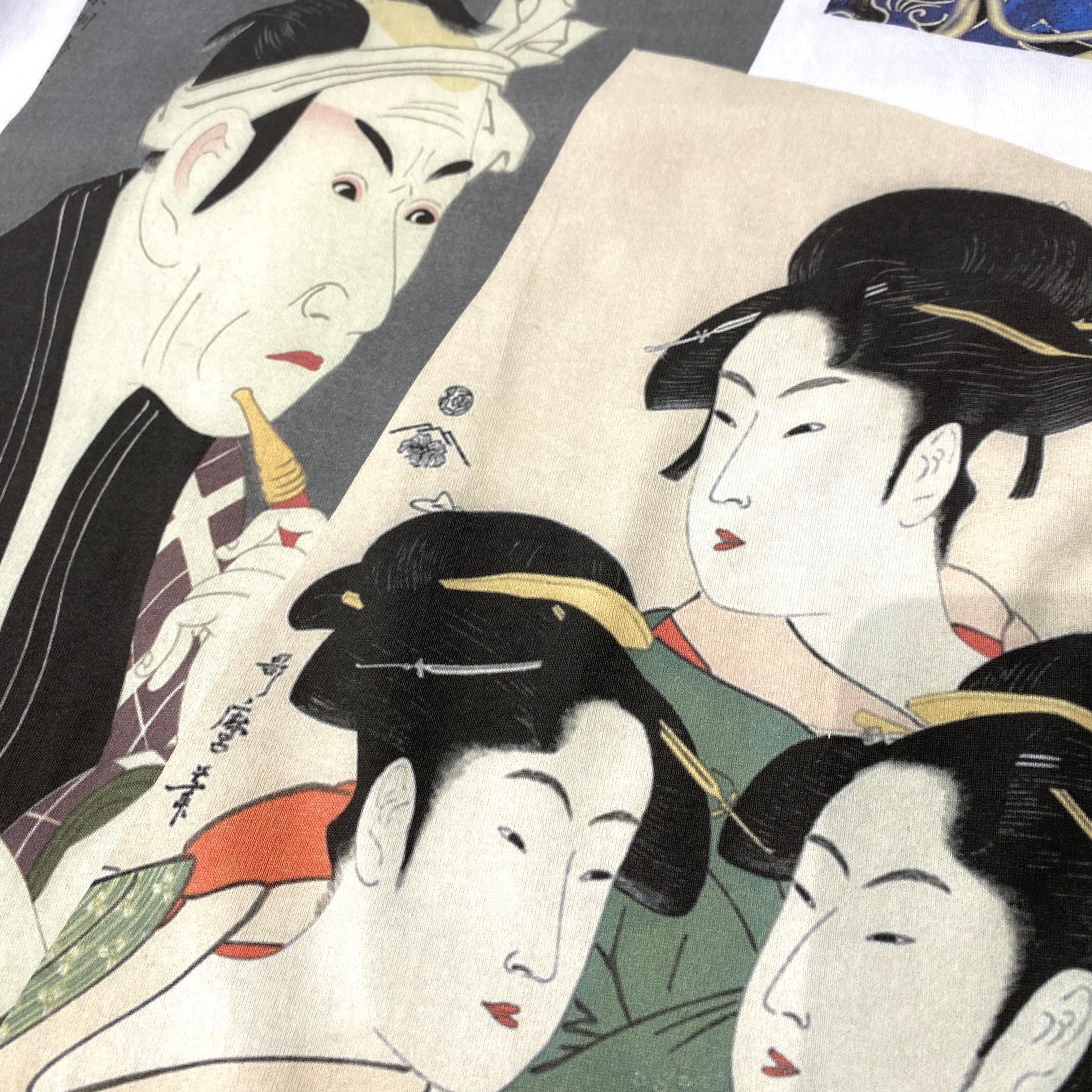 We maximize the appeal of materials that evoke the charm of Japan's old-fashioned history and traditions and transform them into contemporary items. This special piece features a large print of traditional Japanese kimono patterns and representative ukiyo-e prints. The arrangement of the patterns is unique for each item.