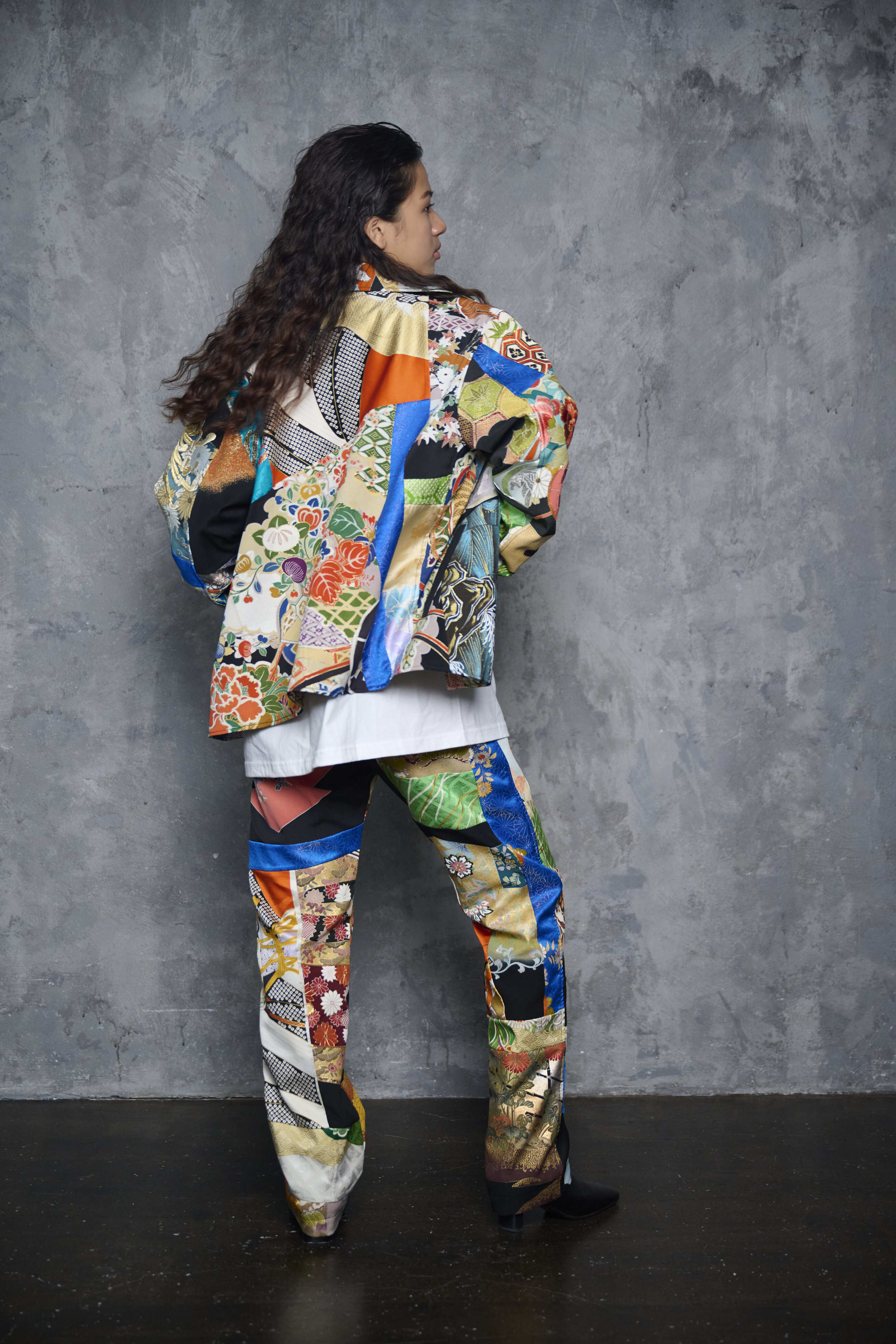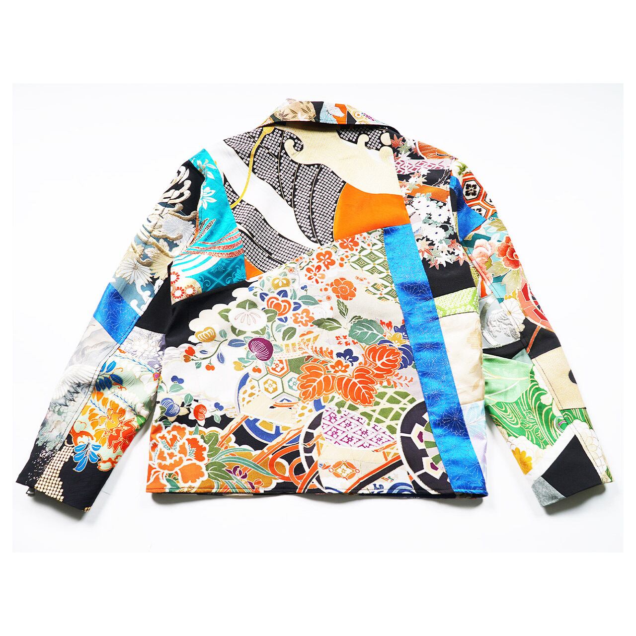 A rider jacket using a kimono that symbolizes Japan. It's a luxurious piece that uses multiple kimonos with many embroidered parts.