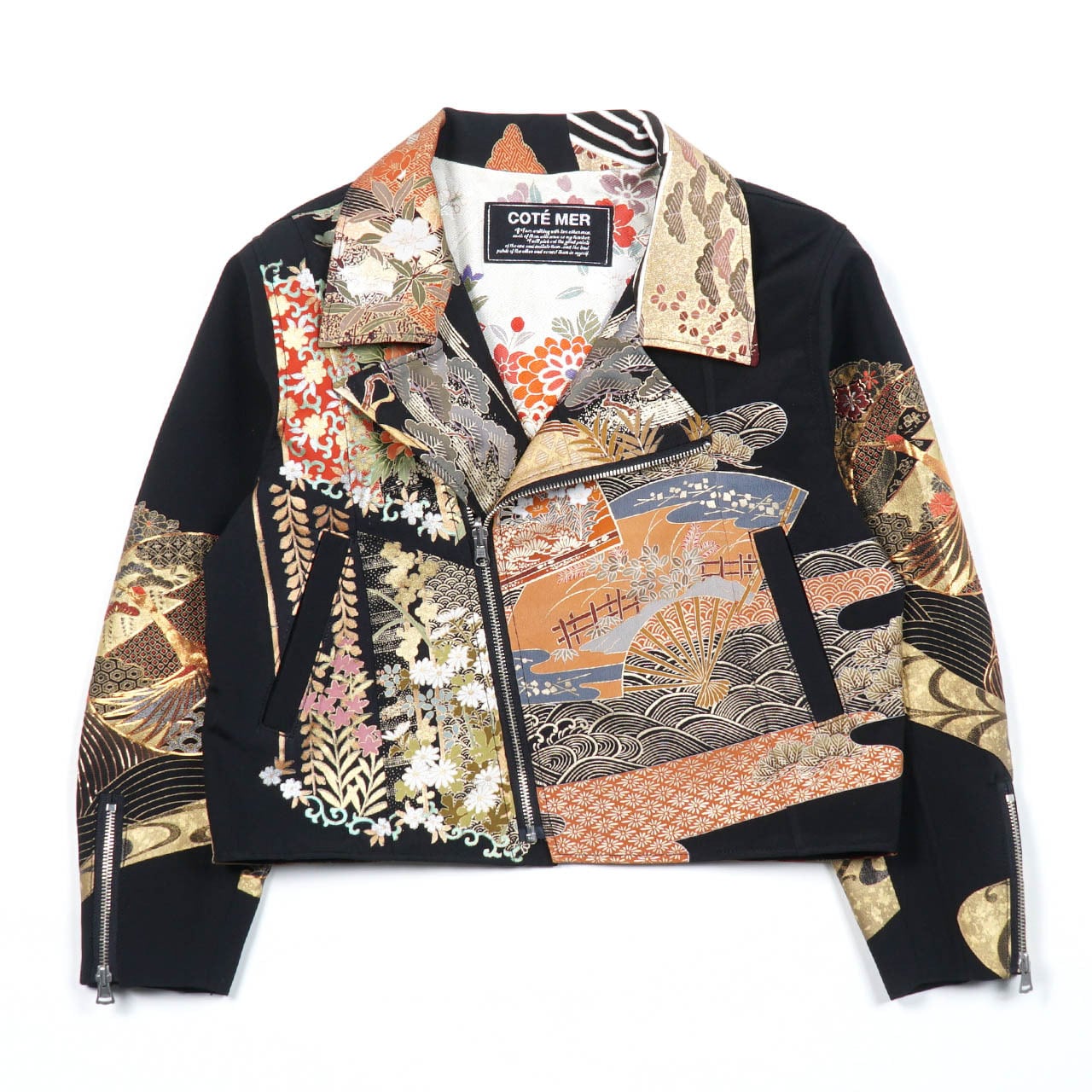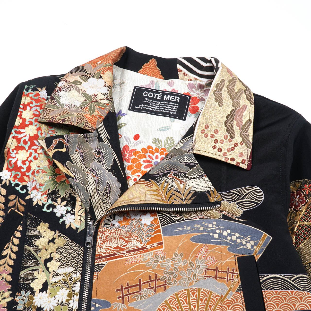 A rider jacket using a kimono that symbolizes Japan. It's a luxurious piece that uses multiple kimonos with many embroidered parts.